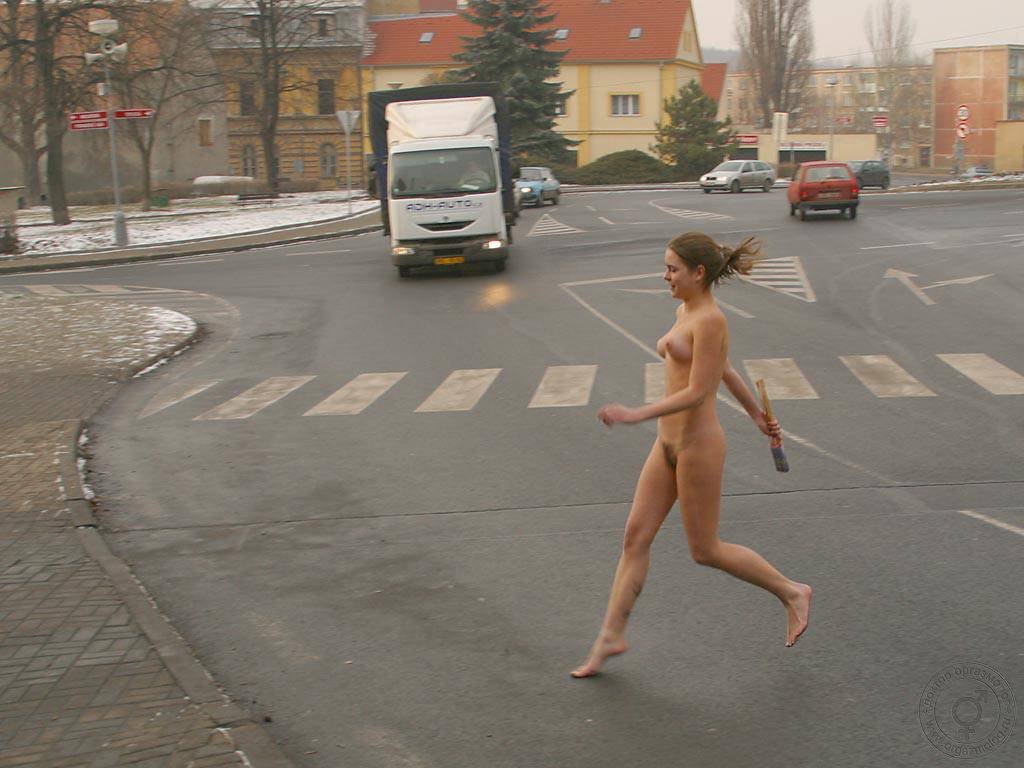 Голая девушка бегает по городу осенью