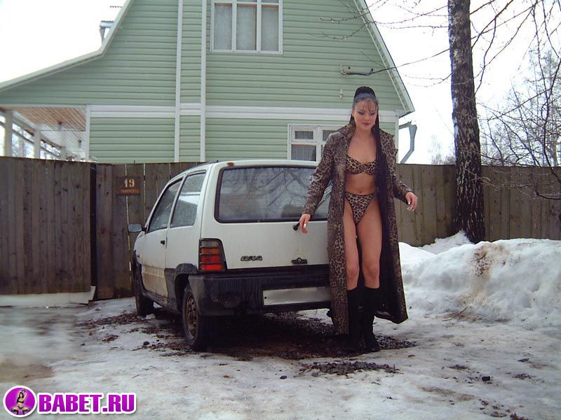 Голая брюнетка шарится по снегу