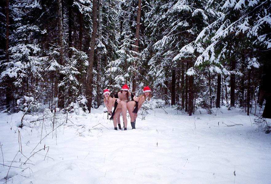 Три голые снегурочки в холодной зимнем лесу